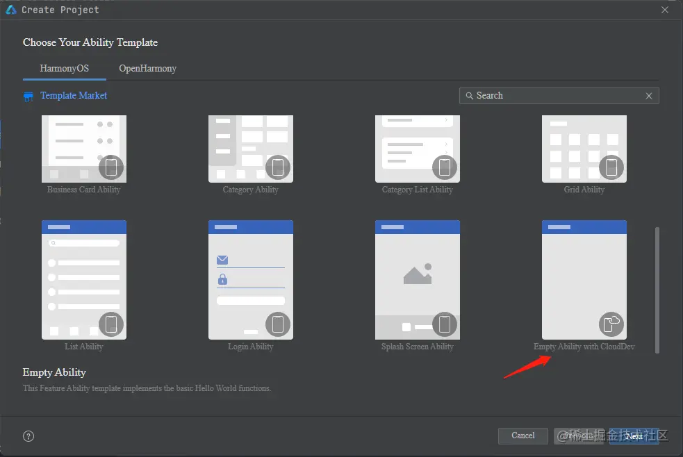 使用DevEco Studio创建端云一体化示例应用程序HelloCloud,选择模板为Empty Ability with CloudDev。