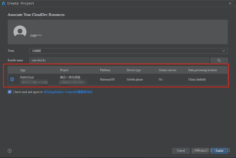 在AppGallery Connect中创建应用完成后,回到DevEco Studio创建工程向导,工程向导会自动查询该组织下,包名下的云端相匹配的应用信息。