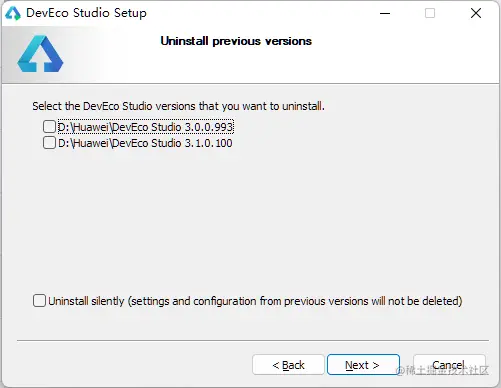 关于DevEco Studio安装将不在过多的赘述,这里只说明一下多版本的安装,在安装向导卸载以前版本界面不做勾选,直接点击Next按钮进行后续操作。