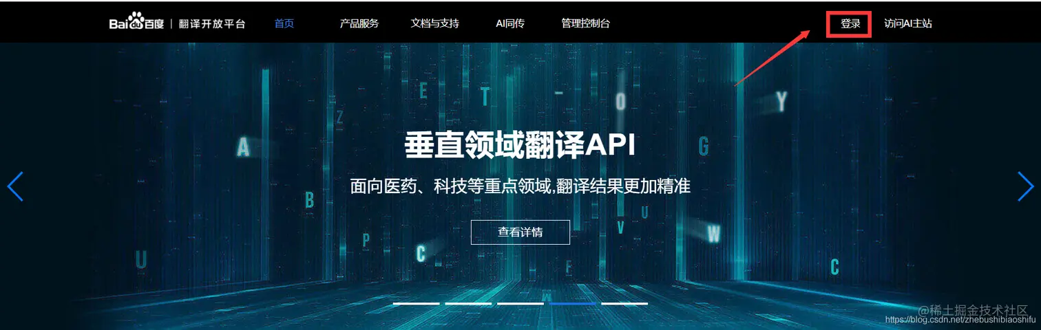 首先,打开百度翻译开放平台网站,首先点击右上角进行登录。