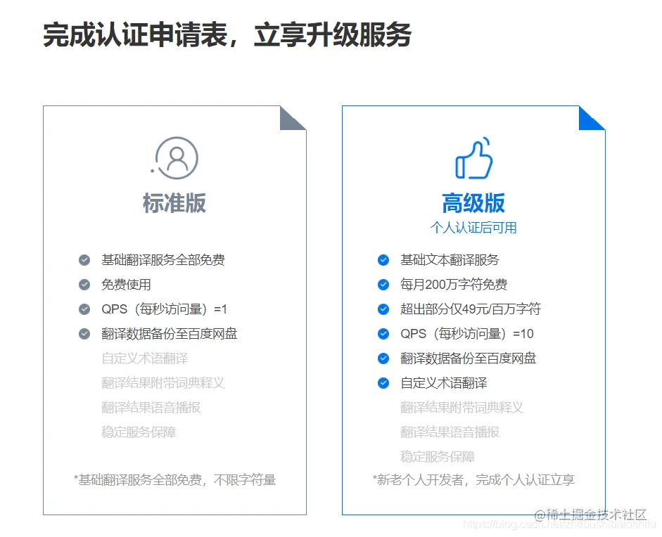 如下图,可以看到如果认证了个人身份,即可使用高级版的翻译接口。