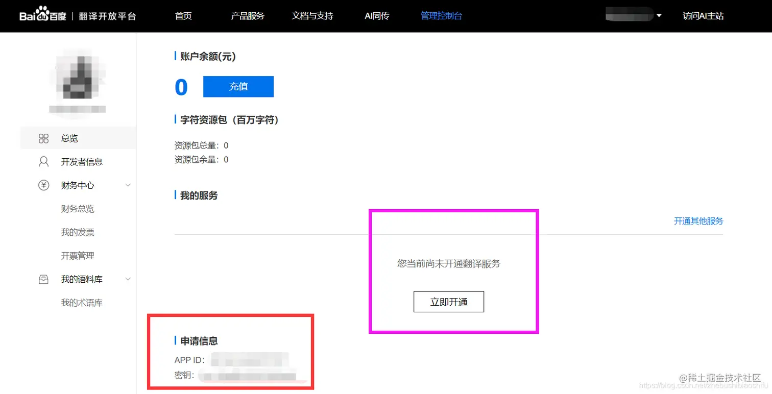 可以看到,此时“管理控制台”中已经有了我们账户的信息,同时接口API以及密钥已经显示在了左下角红色圈内部分。