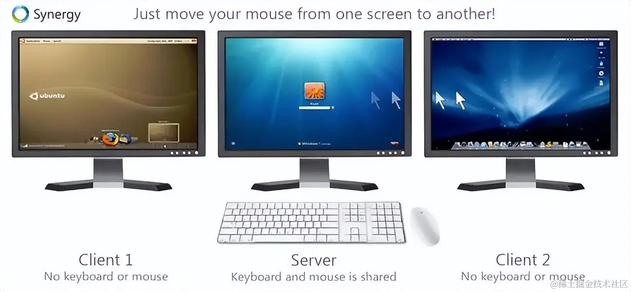 Synergy让你可以轻松地在办公桌上多台计算机之间共享你的鼠标和键盘。你只要将鼠标(指针)从一台计算机的屏幕边缘移出到另一个屏幕就行了。甚至可以共享你的剪贴板,而你所需要的仅仅是一个网络连接。