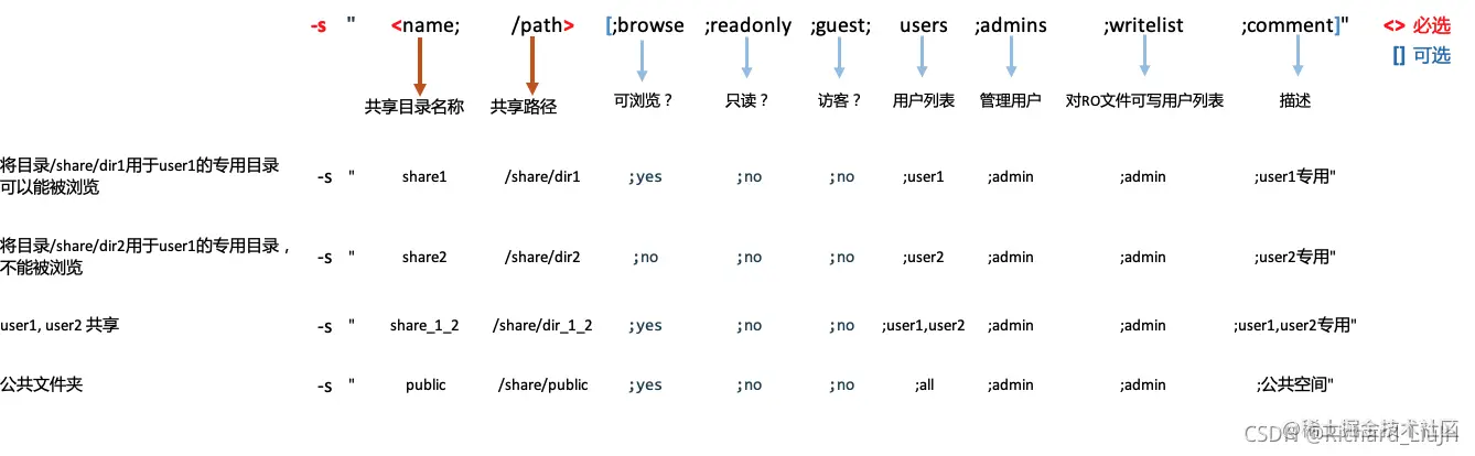 -s "share1;/share/dir1;yes;no;no;user1;admin;admin;user1专用" \