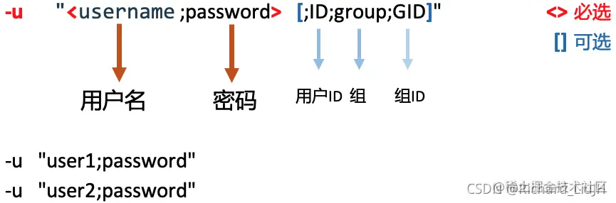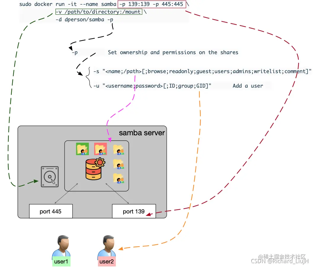 - docker中常见的启动参数就不介绍了,主要是看samba启动时配置的 -p -u 和 -s。如果需要进行权限管理,那么就需要加上-p,否则默认是全公开的访问。那么-u和-s就是对用户以及共享文件的管理参数设置了。