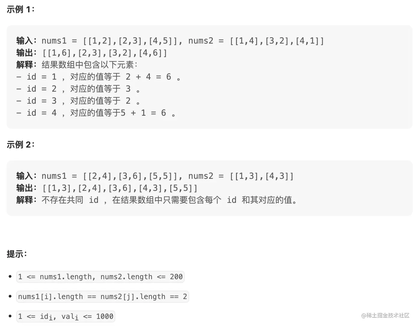 nums1[i] = [idi, vali]表示编号为idi的数字对应的值等于vali。nums2[i] = [idi, vali]表示编号为idi的数字对应的值等于vali。