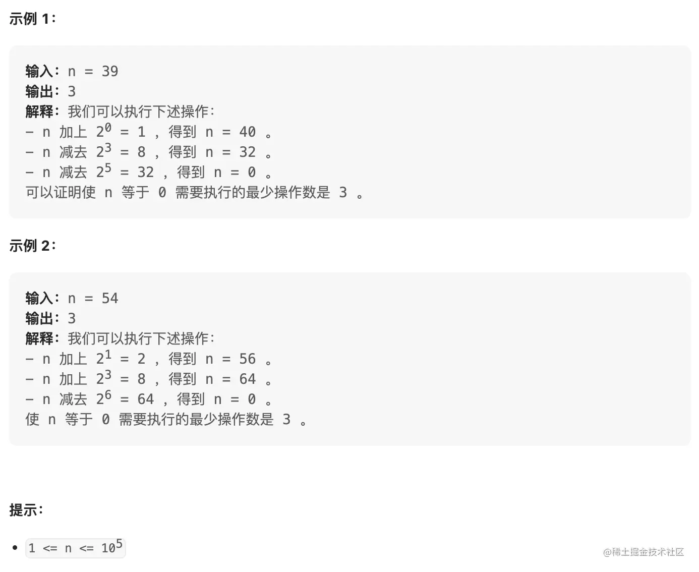 所以我们的算法是:获取当前数字最低位的 ,尝试加上 或减去 并将问题转换为规模更小的数,直到剩下的数正好是 2 的幂结束。递归过程中会存在重复状态,所以需要加上记忆化剪枝。