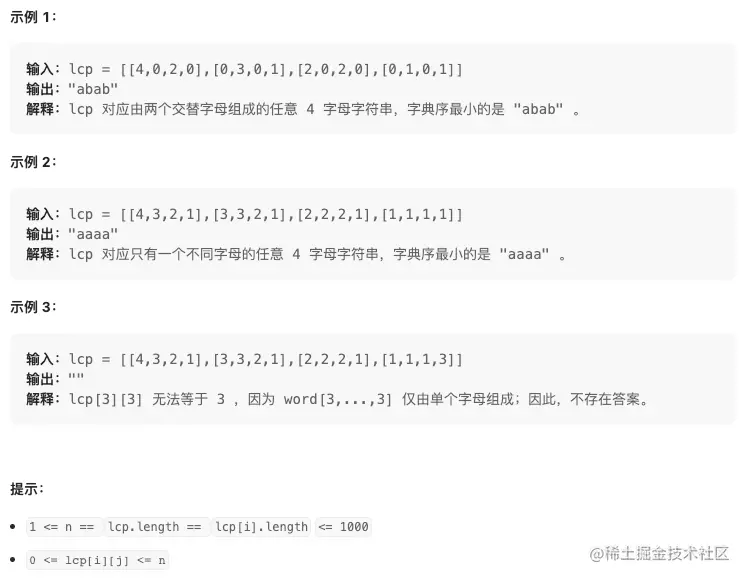 2573. 找出对应 LCP 矩阵的字符串(Hard)