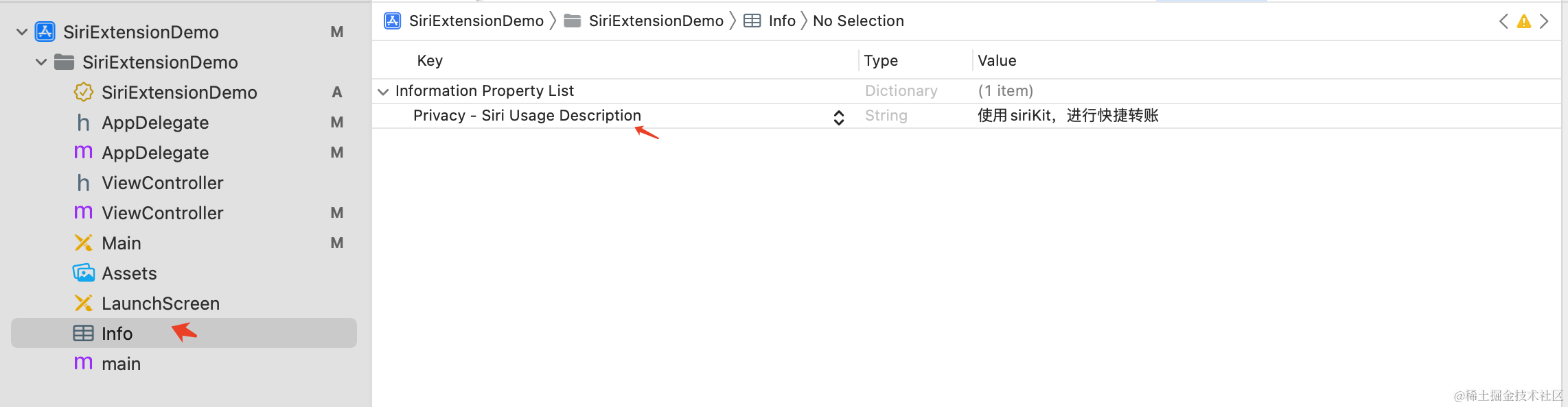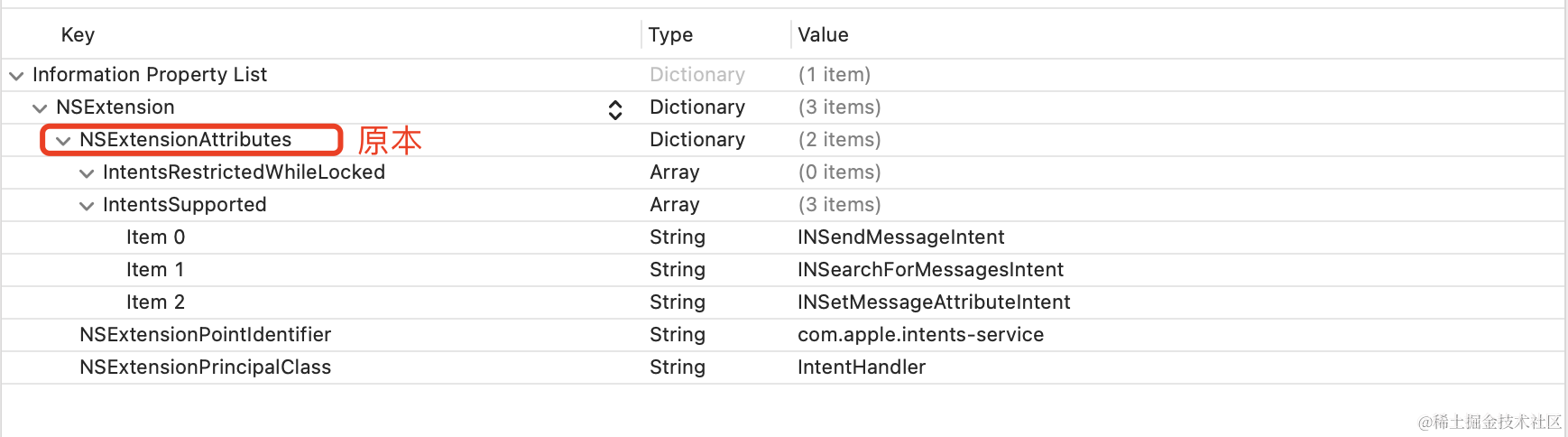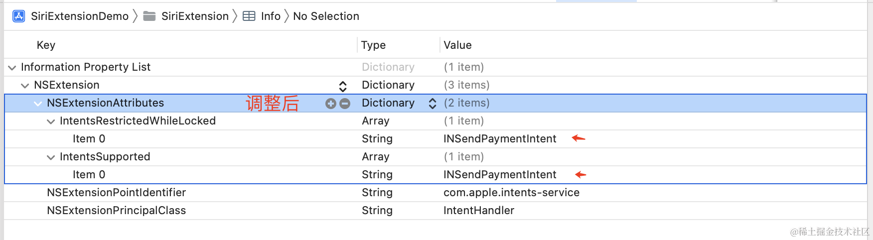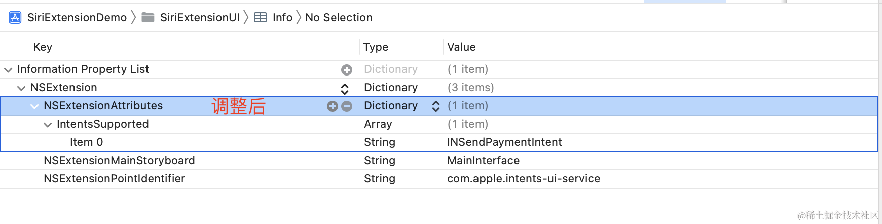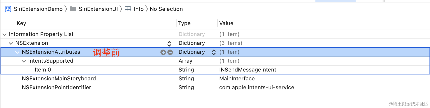 1、 对 SiriExtension -> info.plist -> NSExtension -> NSExtensionAttributes 中的键值对进行调整,调整前和调整后如下所示: