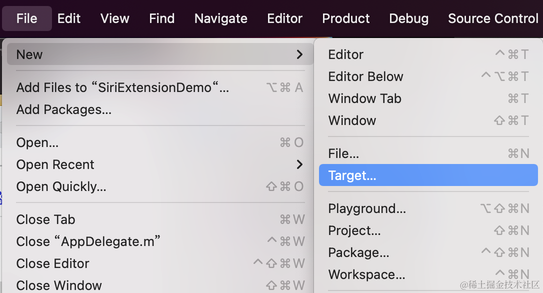 1、 点击 Xcode -> File -> New -> Target ,选择 iOS -> Intents Extension 。