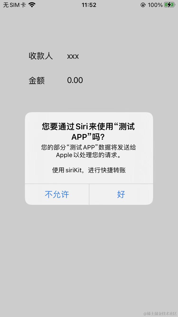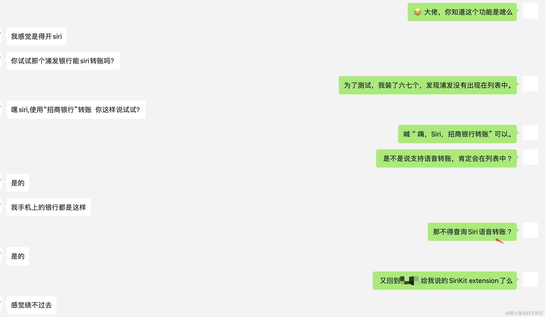 百度了很久,没有找到这个是什么功能,有大佬指点我到官网查询一下,通过查阅发现官网有一个这样的文档 Adding User Interactivity with Siri Shortcuts and the Shortcuts App ,但是通过查阅配置步骤,貌似感觉讲的像是设置如何捷径,感觉自己这个需求又不像是Siri Shortcuts(捷径)功能。最后有一个朋友给我指点,应该是Siri语音转账类。