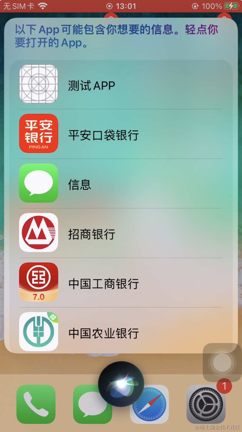 最近公司App要实现下图这样一个功能,对iPhone手机喊 " 嘿,Siri,余额 ”或者 " 嘿,Siri,转账 ” 出现下面的列表,结果列表中展示我们的APP。