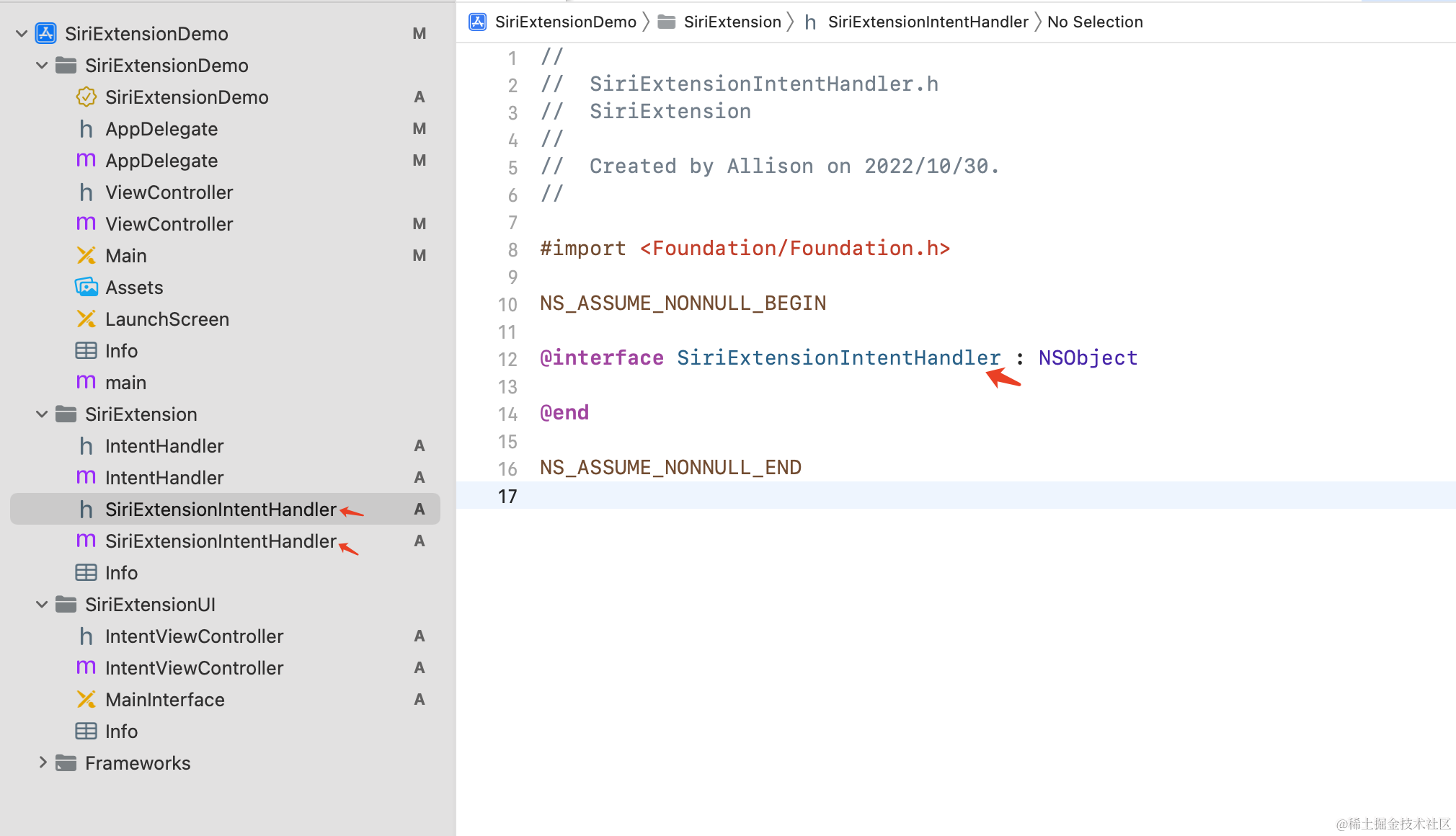1、 在SiriExtension目录下,创建一个**SiriExtensionIntentHandler : NSObject**的类。