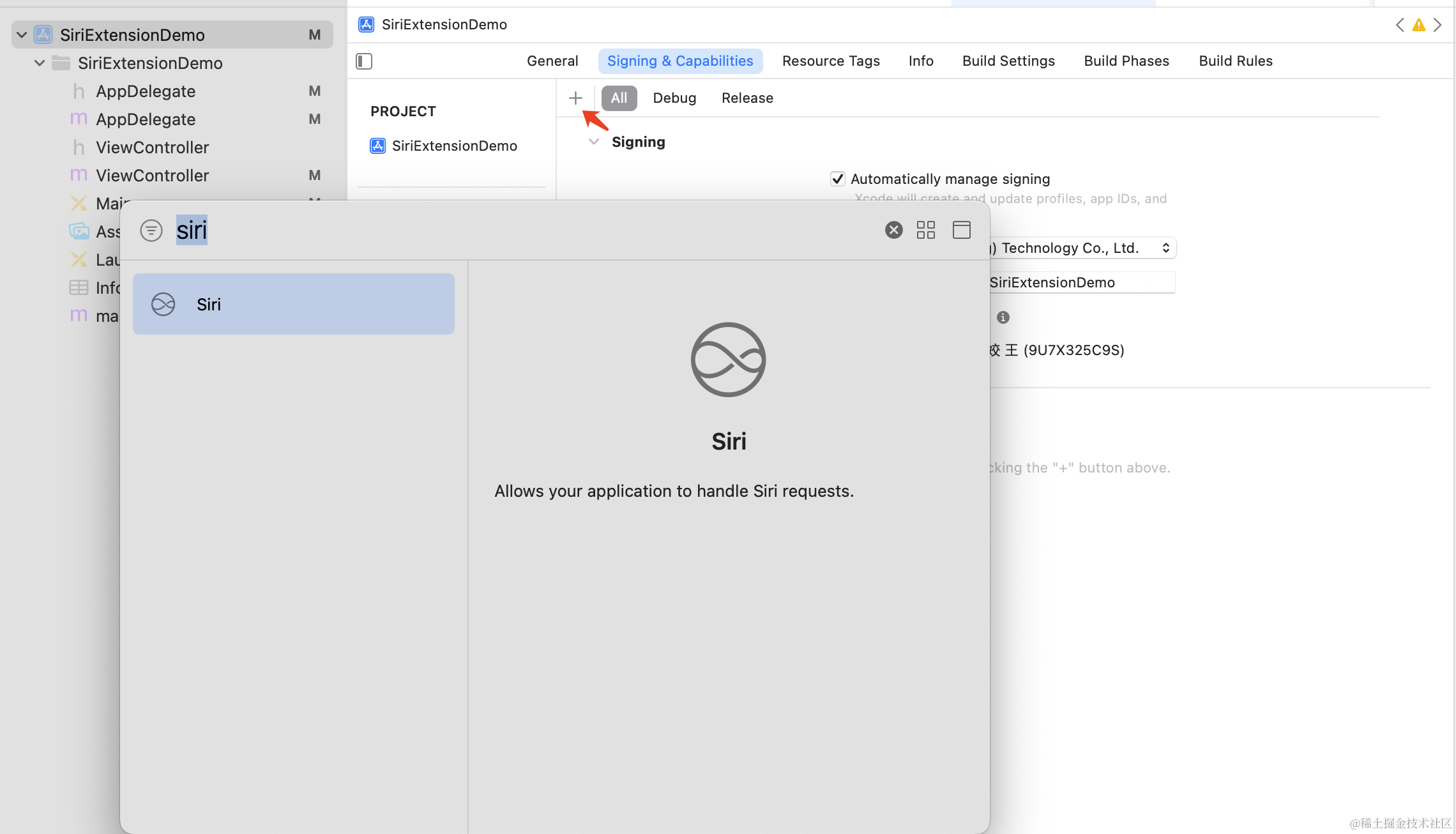 创建一个普通的xcode工程,然后进行如下配置1、 在工程的 Signing&Capabilities 中,点击 +Capability ,添加Siri
