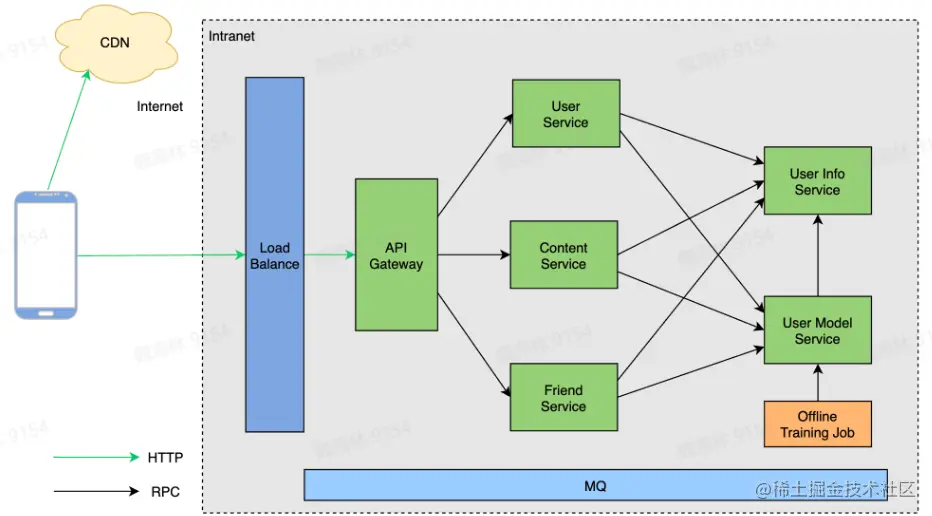 统一网关入口、内网通信多数采用RPC、网状调用链路