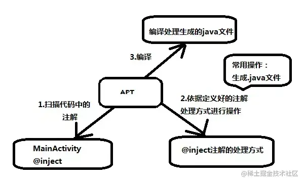 Annotation处理器在处理Annotation时可以根据源文件中的Annotation生成额外的源文件和其它的文件(文件具体内容由Annotation处理器的编写者决定),APT还会编译生成源文件和原来的源文件,将它们一起生成class文件。简言之:APT可以把注解,在编译时生成代码。