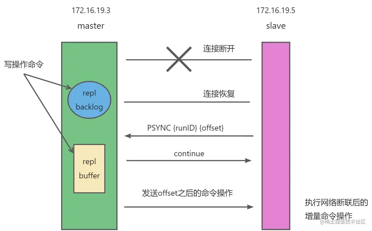 - 增量(同步)复制:只会把主从库网络断连期间主库收到的命令,同步给从库