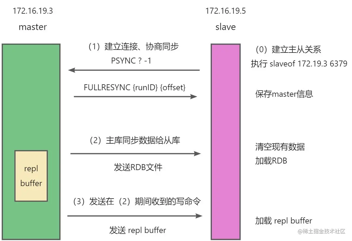第一阶段: 主从库间建立连接、协商同步,主要是为全量复制做准备。在这一步,从库和主库建立起连接,并告诉主库即将进行同步,主库确认回复后,主从库间就可以开始同步了。 具体来说,从库给主库发送 PSYNC 命令,表示要进行数据同步,主库根据这个命令的参数来启动复制。PSYNC 命令包含了主库的 runID 和复制进度 offset 两个参数: