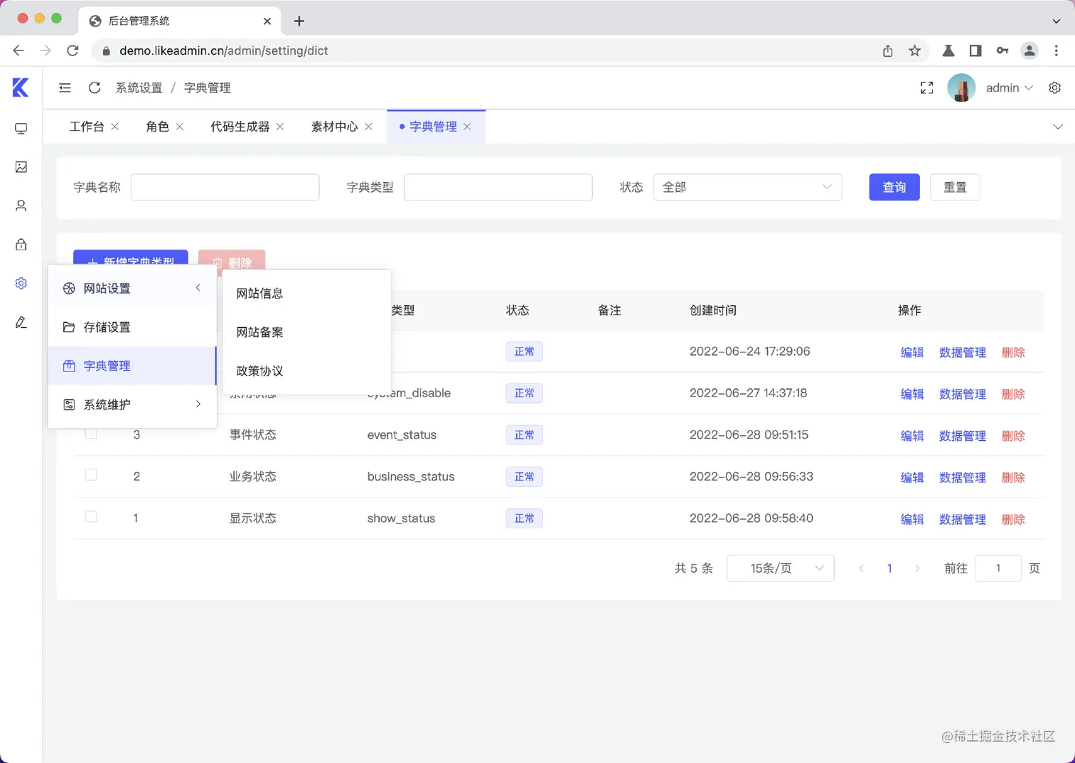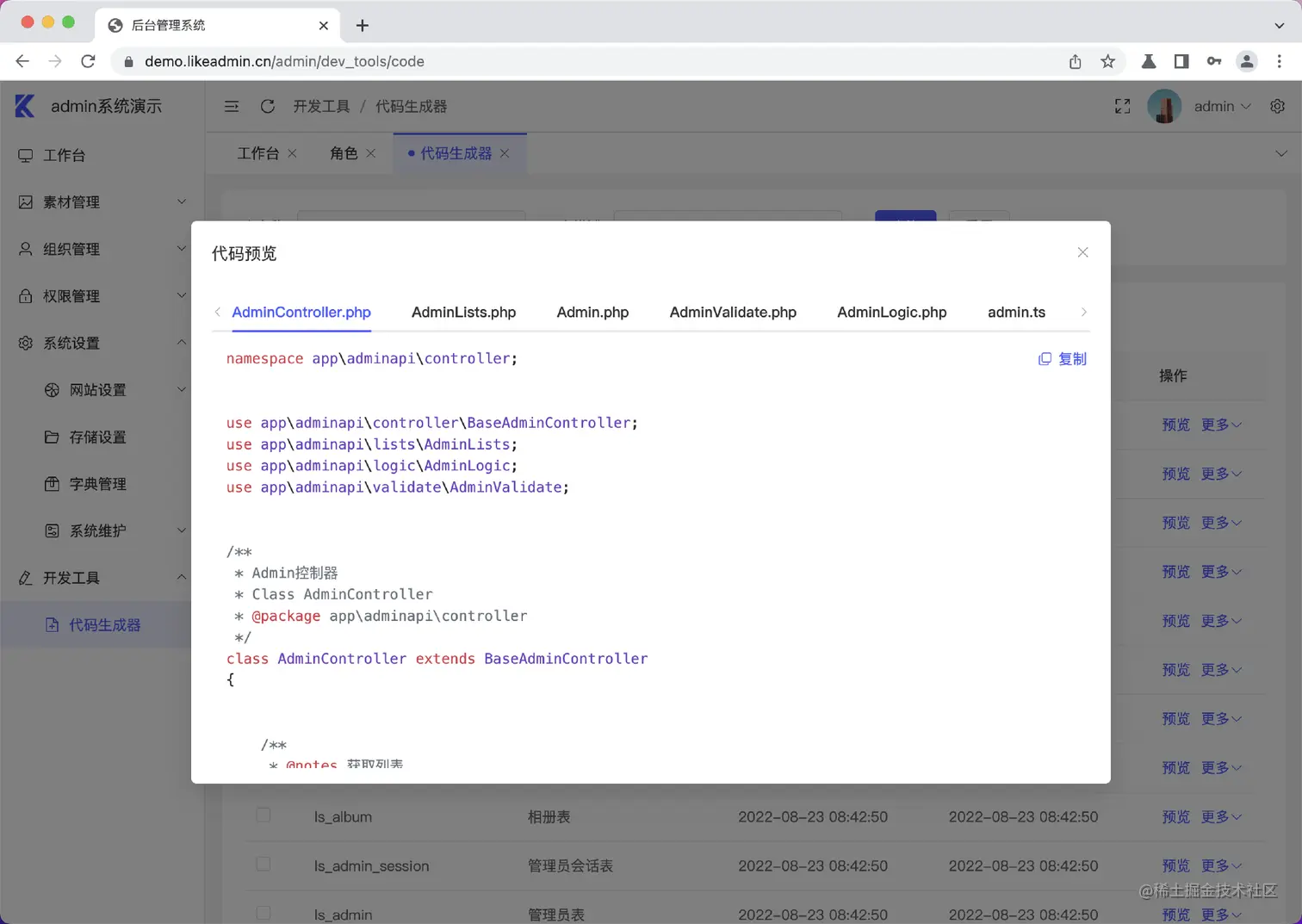 1.likeadmin已经搭建好前后端分离的底层,包含程序安装、登录、登出、工作台、菜单权限控制、角色、管理员、部门管理、岗位管理、素材管理、网站设置、图库管理等基础功能,无需重复造轮子。更有开发者工具功能,一生成代码,大大节省开发时间。