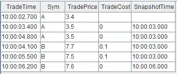 t1 = table(`A`A`B`A`B`B as Sym, 10:00:02.000+(1..6)*700 as TradeTime, (3.4 3.5 7.7 3.5 7.5 7.6) as TradePrice)