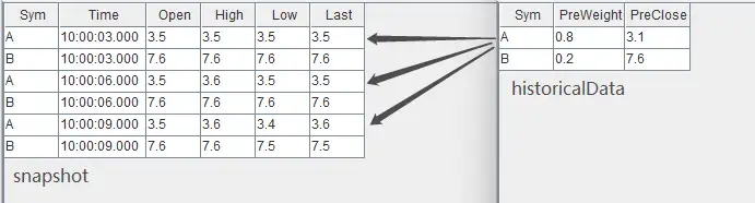 在当日的实时计算中可能会需要依赖历史指标,本例在行情快照的基础上,通过股票代码关联该股票在昨日的日频指标。