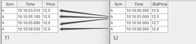 t2 = table(take(`A, 4) as Sym, 10:10:00.000+(0 3000 6000 9000) as Time, 12.6 12.5 12.7 12.6 as BidPrice)