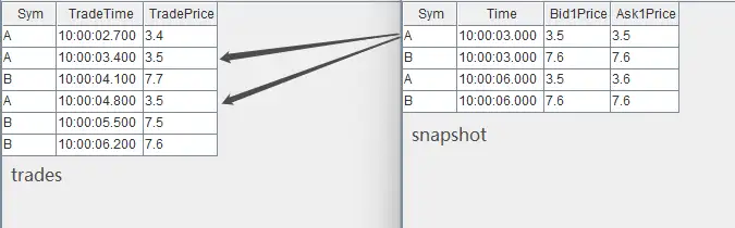 - 行情快照数据 snapshot 注入引擎的左表,逐笔成交数据 trades 注入引擎的左表。