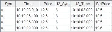 share table(1:0, `Time`Sym`Price`t2_Time`BidPrice, [TIME, SYMBOL, DOUBLE, TIME, DOUBLE]) as output