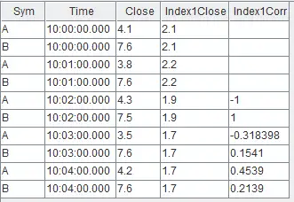 关联得到的结果表 output 如下,对于股票 A 、B 每分钟都会关联对应分钟的指数 idx1 。因为 mcorr 滑动窗口为3,所以前两分钟结算结果为空。