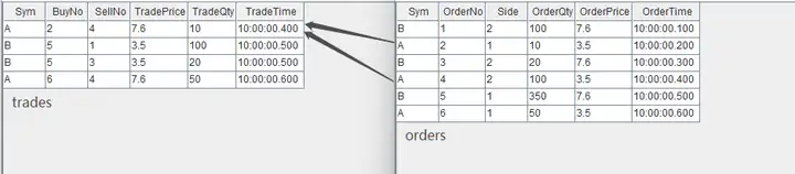 t2 = table(`B`A`B`A`B`A as Sym, 1..6 as OrderNo, [2, 1, 2, 2, 1, 1] as Side, [100, 10, 20, 100, 350, 50] as OrderQty, [7.6, 3.5, 7.6, 3.5, 7.6, 3.5] as OrderPrice, 10:00:00.000+(1..6)*100 as OrderTime)