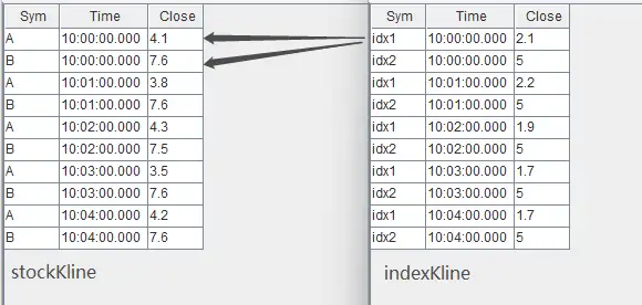 - 订阅指数数据 indexKline 时指定 hanlder 为自定义函数 appendIndex ,是指不断地收到 indexKline 数据后,首先过滤出指数数据中指数名为 idx1 的数据,然后再注入连接引擎的右表。