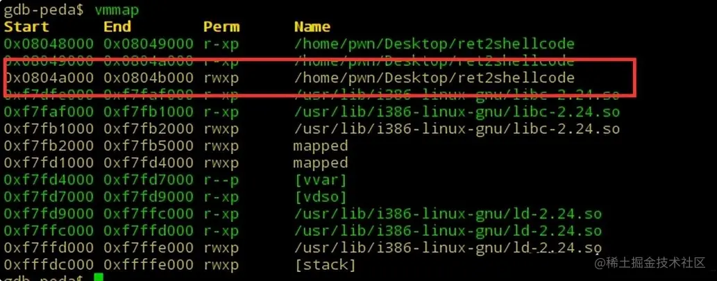 如同ret2shellcode一节中做法一样,在bss段找到一个数组,确保其有执行权限
