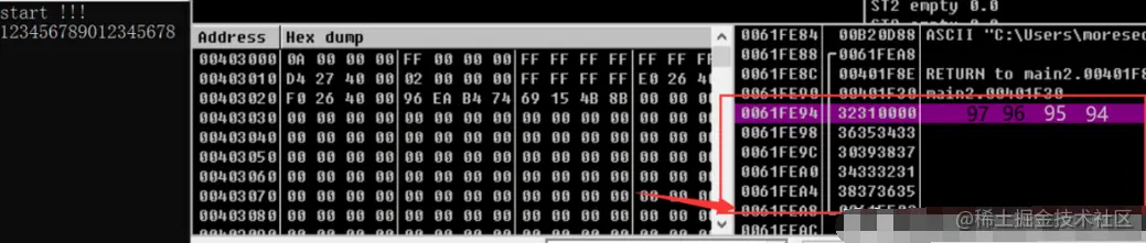 可以知道s所在位置为esp+0x16,esp=0x0061FE80,那么s所在位置为61FF96,也就是ebp-0x12,因此填充18个字符即可满足溢出的临界条件