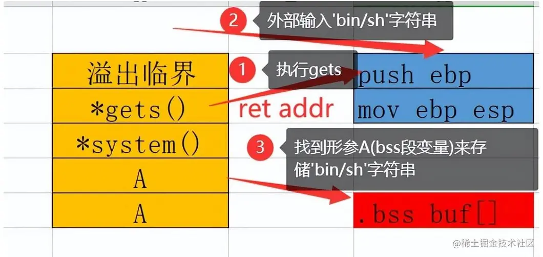 没有了"/bin/sh"字符串,就没办法获取shell,那么我们就得创造条件。除了现成的内容,我们也可以人工输入,那么就需要gets()函数来实现这一目的,因此目前的结构应该如下图所示。