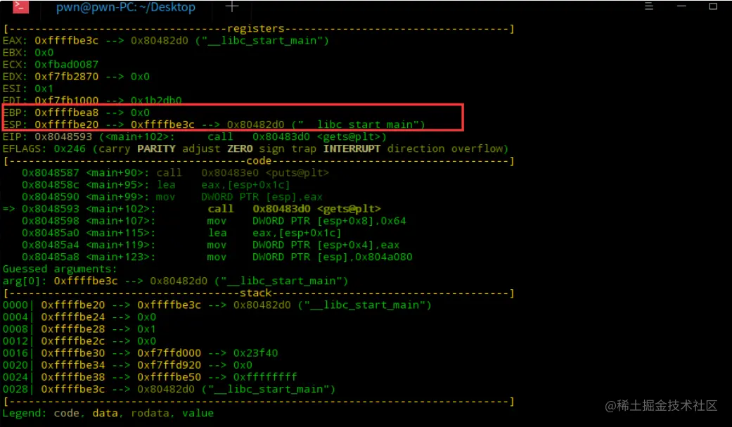 在get处设置断点,来确定s变量与ebp的距离,可以看到 s 的地址为 0xffffbe3c,计算一下得出 s 相对于 ebp 的偏移为 0x6c。