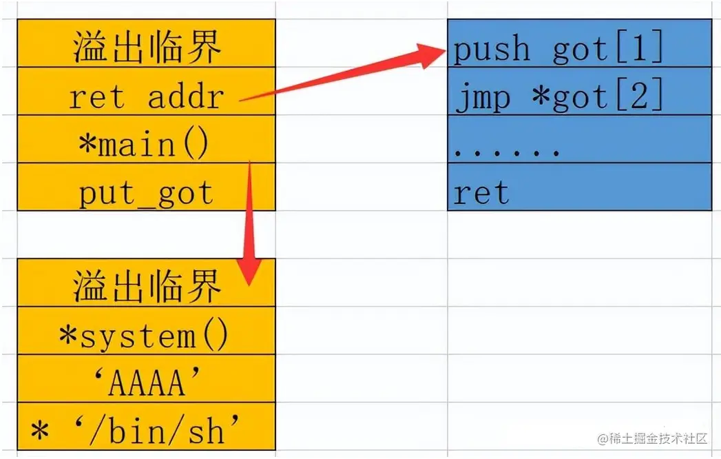 我们知道,操作系统通常使用动态链接的方法来提高程序运行的效率。那么在动态链接的情况下,程序加载的时候并不会把链接库中所有函数都一起加载进来,而是程序执行的时候按需加载。也就是控制执行 libc(对应版本) 中的函数,通常是返回至某个函数的 plt 处或者函数的具体位置 (即函数对应的 got 表项的内容)。一般情况下,我们会选择执行 system(“/bin/sh”)(或者execve("/bin/sh",NULL,NULL)),故而此时我们需要知道 system 函数的地址,具体可以移步深入理解GOT表和PLT表。