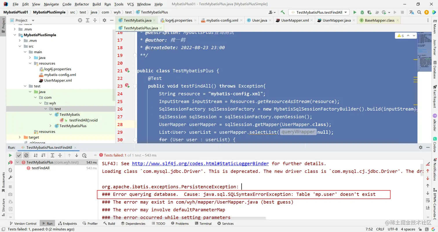 ### Cause: java.sql.SQLSyntaxErrorException: Table 'mp.user' doesn't exist