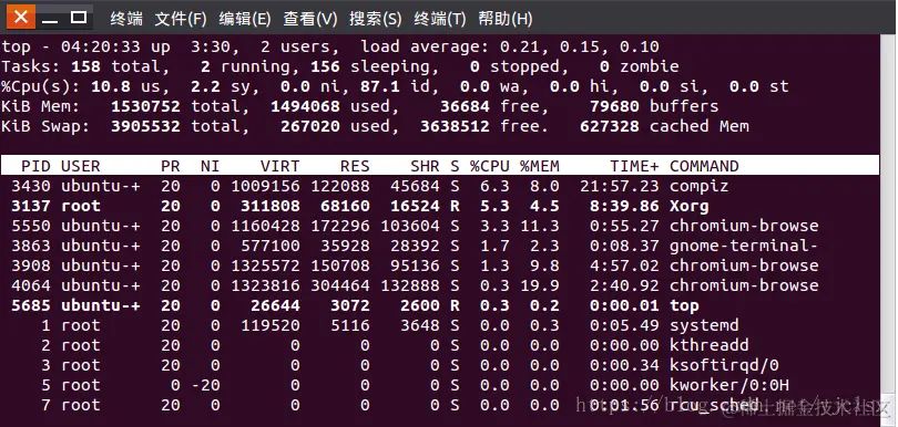 | 第5行:KiB Swap: 3905532 total, 267544 used, 3637988 free. 617312 cached Mem | |