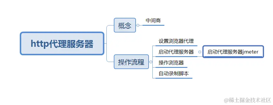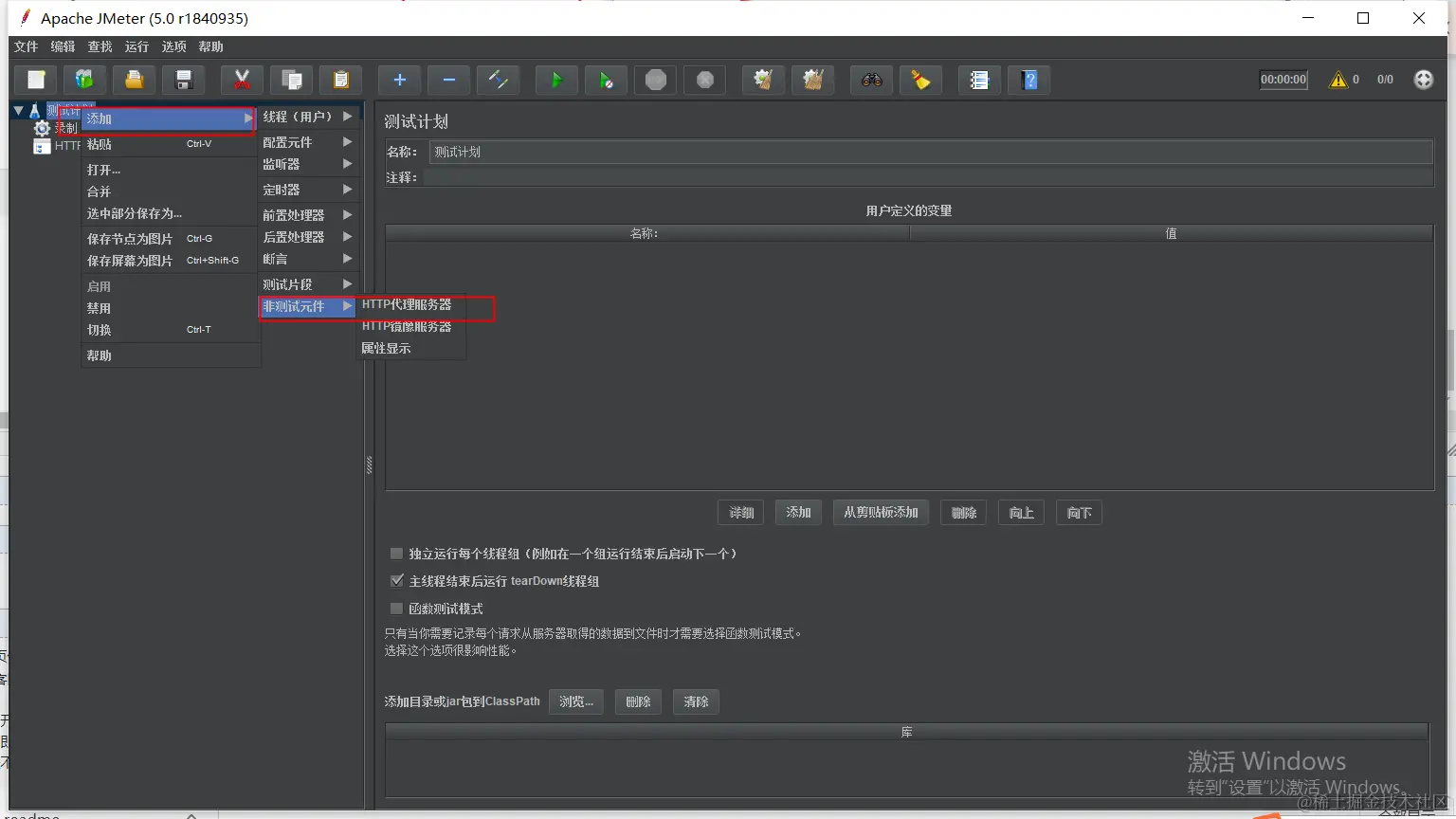 b、打开jmeter,新建线程组,目的为了录制后的脚本有地方存放,目标控制器选择对应的主线程组,存放脚本,添加非测试元件:http代理服务器,点击启动后则可以进行录制,录制完成后停止,在线程组中回出现请求的录制脚本