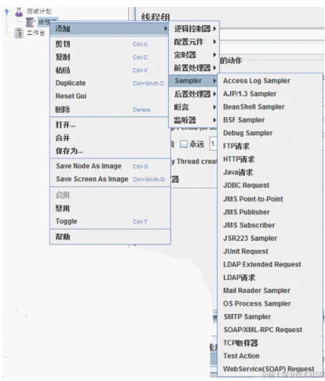 取样器(Sampler)是性能测试中向服务器发送请求,记录响应信息,记录响应时间的最小单元,JMeter 原生支持多种不同的sampler , 如 HTTP Request Sampler 、 FTP Request Sampler 、TCP Request Sampler 、 JDBC Request Sampler 等,每一种不同类型的 sampler 可以根据设置的参数向服务器发出不同类型的请求。