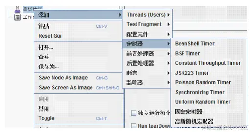定时器(Timer)用于操作之间设置等待时间,等待时间是性能测试中常用的控制客户端QPS的手段。类似于LoadRunner里面的“思考时间”。 JMeter 定义了Bean Shell Timer、Constant Throughput Timer、固定定时器等不同类型的Timer。