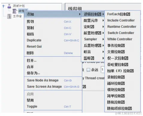 逻辑控制器,包括两类无件,一类是用于控制test plan 中 sampler 节点发送请求的逻辑顺序的控制器,常用的有 如果(If)控制器 、 switch Controller 、Runtime Controller、循环控制器等。另一类是用来组织可控制 sampler 来节点的, 如 事务控制器、吞吐量控制器。
