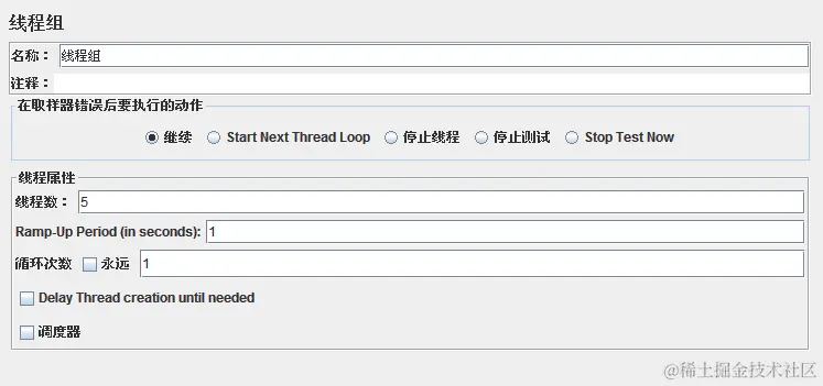 这个就是我们通常添加运行的线程。通俗的讲一个线程组,,可以看做一个虚拟用户组,线程组中的每个线程都可以理解为一个虚拟用户。线程组中包含的线程数量在测试执行过程中是不会发生改变的。