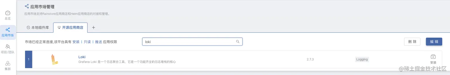 在 平台管理 -> 应用市场 -> 开源应用商店 中搜索 Loki 并安装。