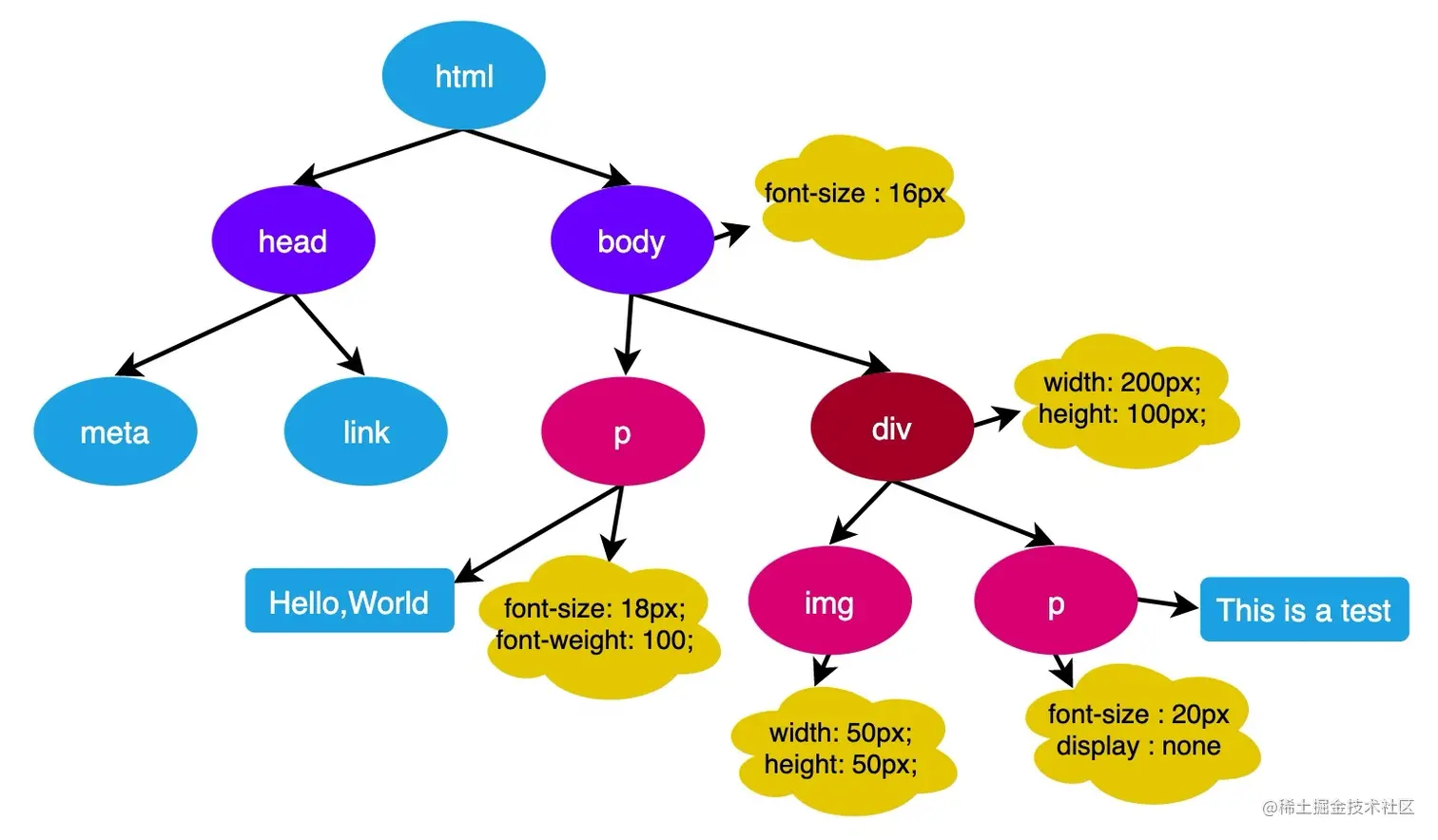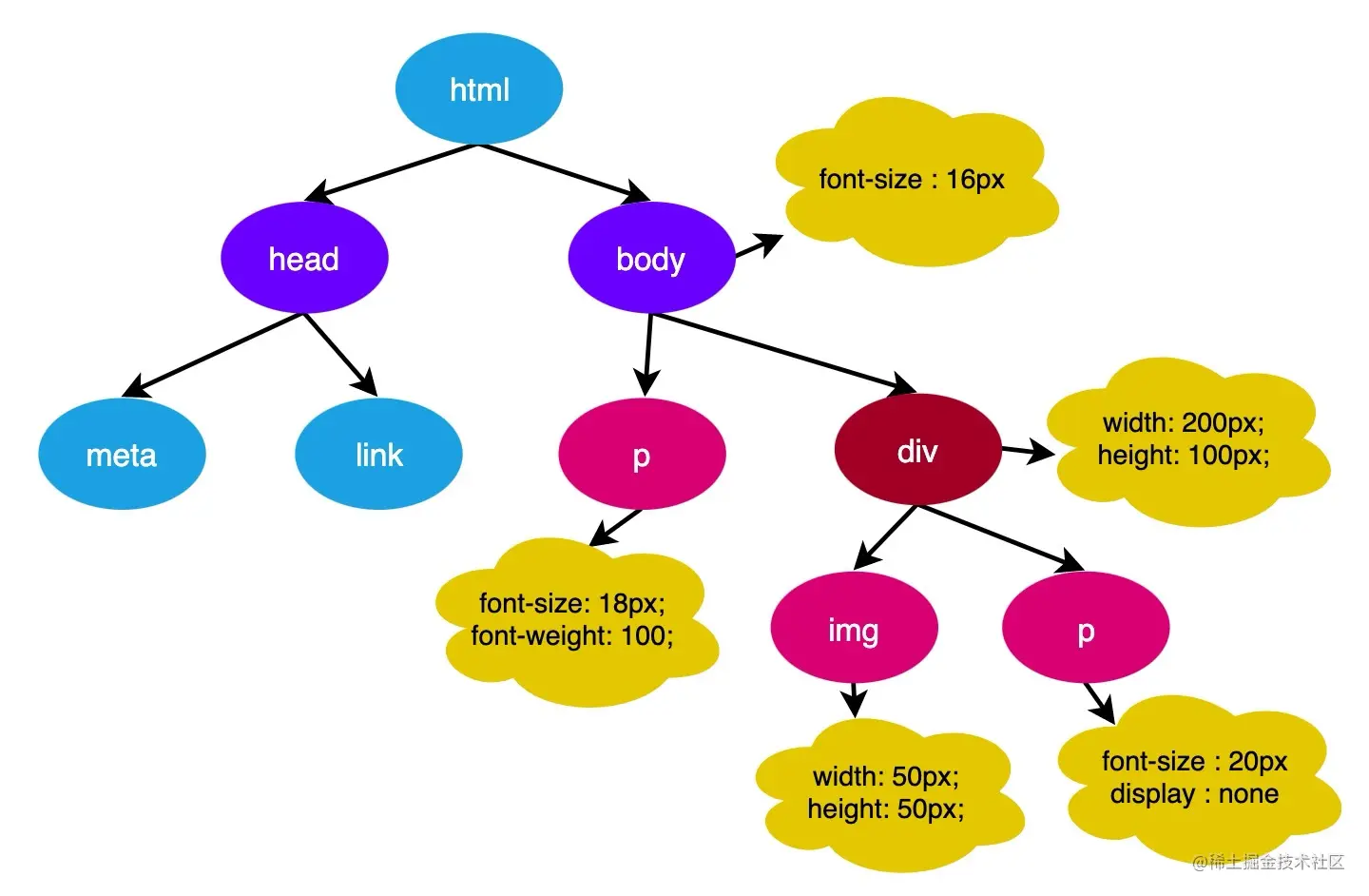在这一过程中,浏览器会确定每一个节点的样式到底是什么,并最终生成一颗样式规则树,这棵树上面记录了每一个 DOM 节点的样式。
