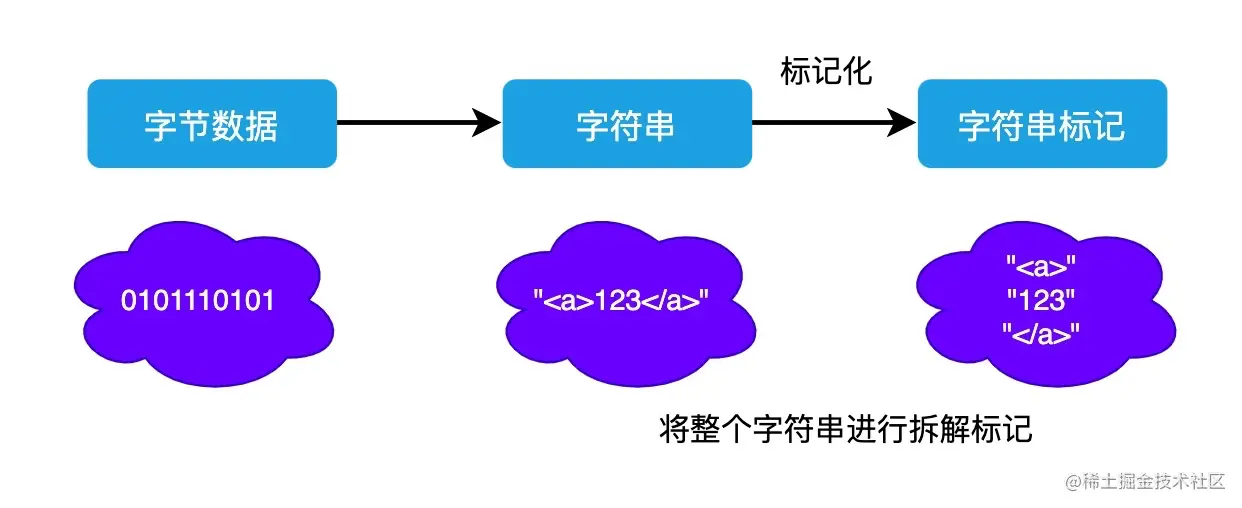 当数据转换为字符串以后,浏览器会先将这些字符串通过词法分析转换为标记( token ),这一过程在词法分析中叫做标记化( tokenization )。