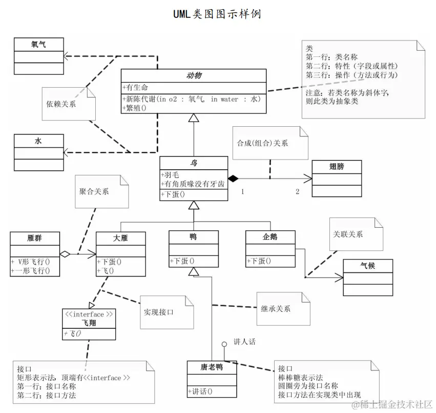 为了在之后的学习中更好地理解设计模式,我们需要先学习一下如何绘制、阅读UML类图。绘制UML类图,可以使用Visio或者Drawio。以下面这幅图为例,捋清常见的关系,多看并记忆即可: