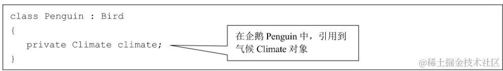 关联关系即是某个类是另一个类的成员属性,(如上图企鹅和气候,企鹅需要了解气候)用实线箭头,用代码表示就是: