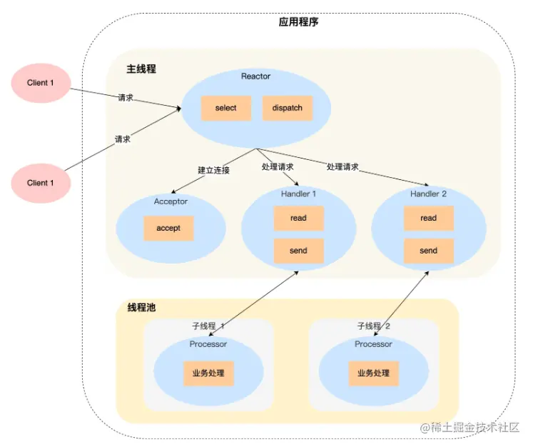 - Handler 对象不再负责业务处理,只负责数据的接收和发送,Handler 对象通过 read 读取到数据后,会将数据发给子线程里的 Processor 对象进行业务处理;